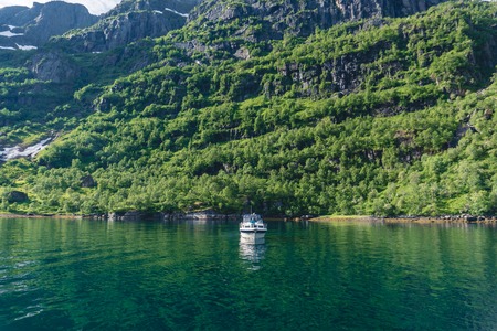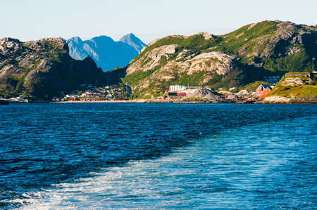 View towards mountains from boat on a cloudy sky in Reine. During the summer trip to the Norwegian north. Lofoten, Norway.