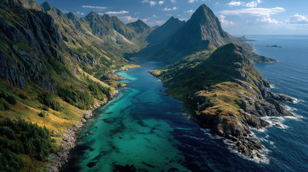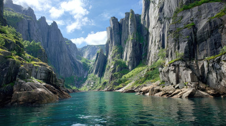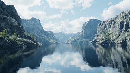 Majestic mountains rise steeply on either side of serene fjord, reflecting beauty of nature. clear blue sky and scattered clouds enhance tranquil atmosphere of this stunning landscape