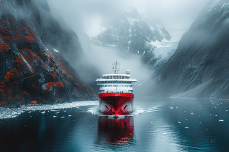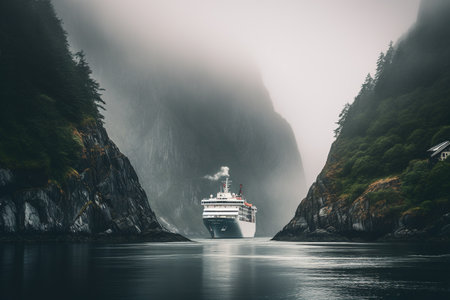 Cruise ship sailing in misty fjord among rising mountains. Generative AI.