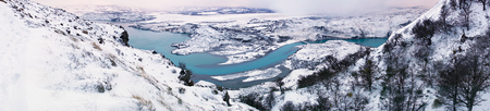 Winter landscape of lakes and snow covered hills and mountains in Torres del Paine National Park in Patagonia, Chile.