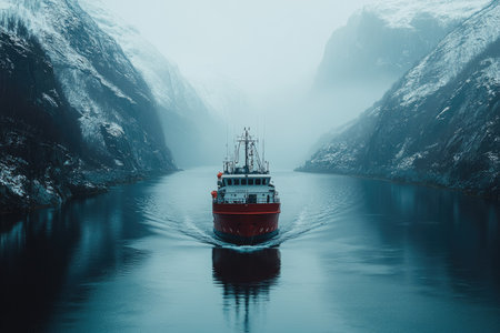 Red fishing boat sailing through a narrow passage between cliffs covered with snow and ice, creating a breathtaking winter landscape in Norway