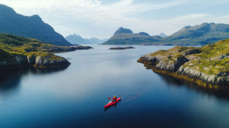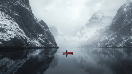 solo kayaker in a bright red kayak exploring a fjord with deep blue waters. generative ai
