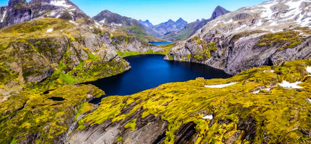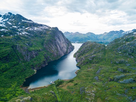 Aerial view of mountains and a lake in Lofoten Islands, Norway