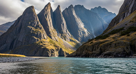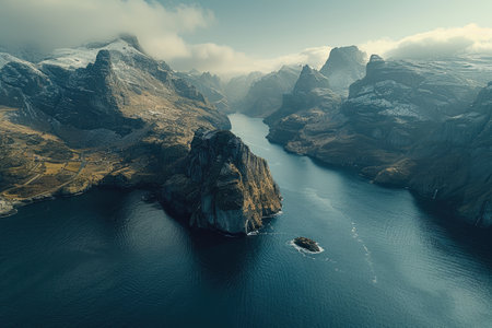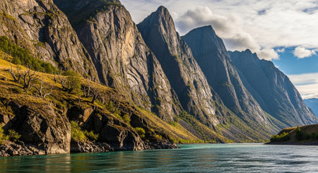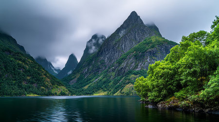Majestic Norwegian Fjord Surrounded by Towering Rugged Peaks and Dramatic Cloudy Skies in Nature