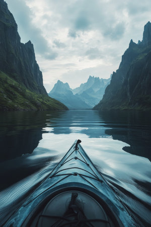 A person is kayaking in still waters, framed by towering mountains and lush greenery under a cloudy sky. The tranquil atmosphere creates a peaceful outdoor experience.