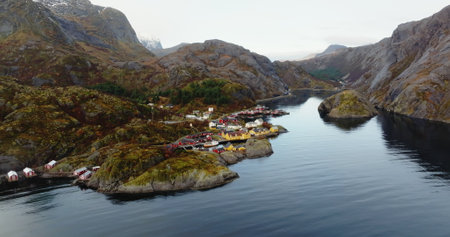 Serene Nusfjord: Aerial View of a Traditional Fishing Village in Norway