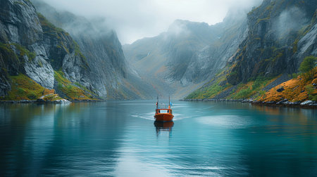 An orange fishing boat sails on a calm, blue fjord in Norway, flanked by towering, mist-shrouded mountains and lush green and orange foliage.