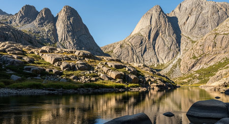mountain range landscape stock, in the style of photo-realistic landscapes, sparkling water reflections