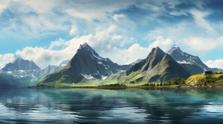 a serene mountain landscape in lofoten, captured in a digital background paper, showcases the beauty of nature. this lake scene, reminiscent of philip evergood's art style, transports viewers to a tranquil setting surrounded by majestic mountains. ai generated