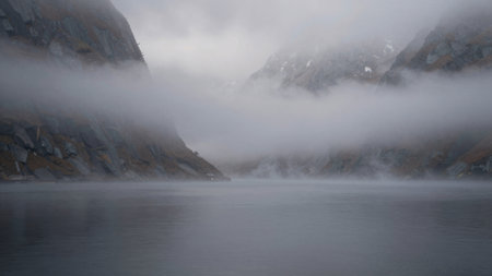 A tranquil lake reflects the muted tones of a misty morning. Rugged cliffs rise steeply on either side, obscured by low-hanging fog and clouds. Nature’s stillness invites contemplation and peace.