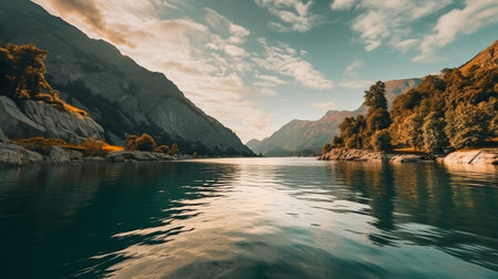The tranquil mountain range and calm lake create a harmonious natural landscape. Generative AI