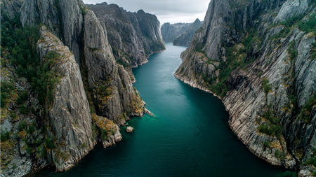 Tall cliffs surround a deep waterway under overcast skies, highlighting the raw landscape of a Nordic fjord in a remote area.