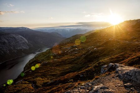 Sunset in the Norwegian mountains. The orange light on the fjord