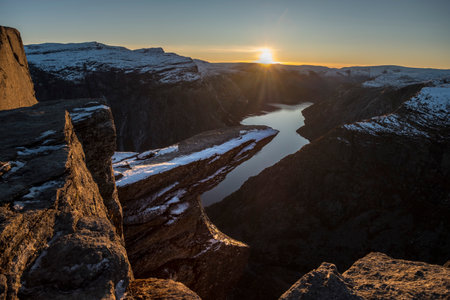 The last ray of the setting sun over the Ringedalsvatnet lake near Trolltunga in Norway.