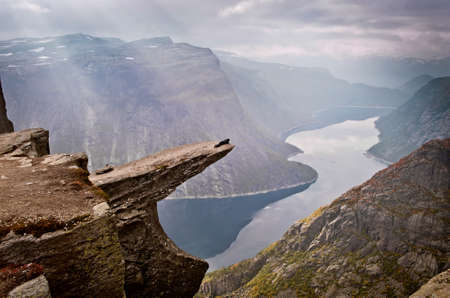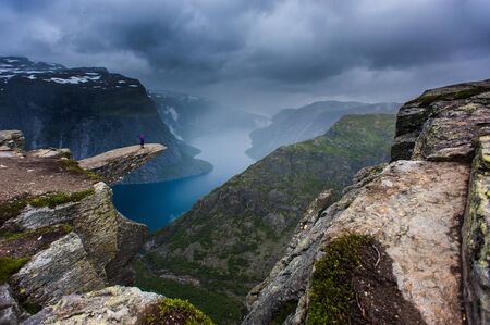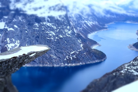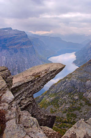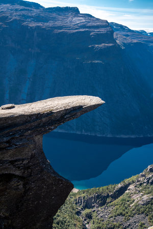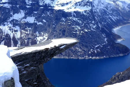 Norwegian landscape with a view of the fjord from a rock fragment Troll's tongue