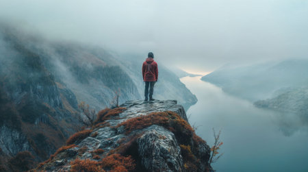 A man in a red jacket stands on a misty cliff, overlooking a serene river winding through a foggy valley, creating a peaceful scene.