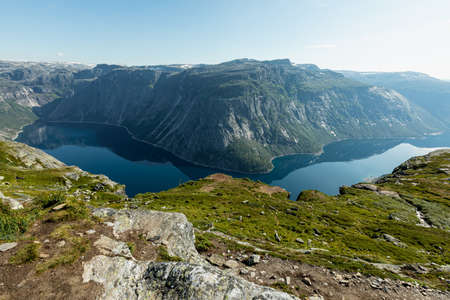 Panorama of Ringedalsvatnet lake near Trolltunga rock - most spectacular and famous scenic cliff in Norway. Landscape photography