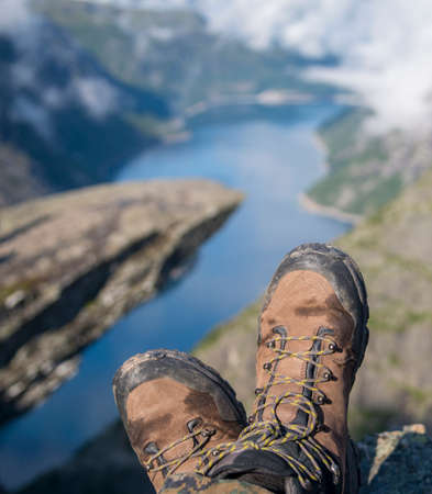 Hiking boots in foreground. Troll tongue (Trolltunga) and Norway fjord in the background.