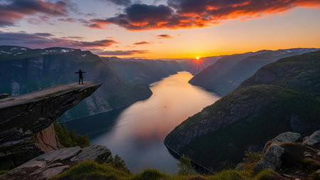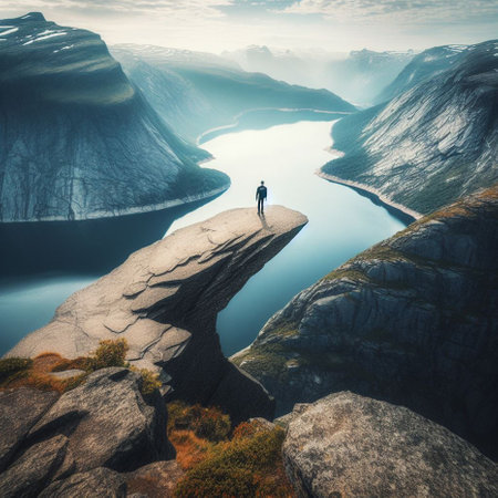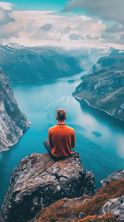 A solo traveler stands at edge of cliff, overlooking breathtaking fjord surrounded by majestic mountains and clear blue skies