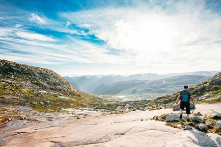 Tourist man on trail to Kjeragbolten. Amazing landscapes of the Norwegian mountains, where the famous boulder stuck at an altitude of 984 meters above Lysefjorden on Mount Kjerag, Norway.
