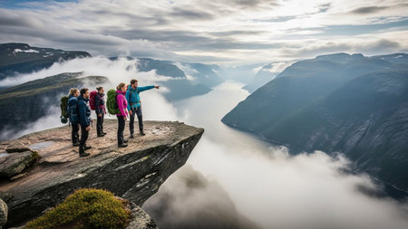 A group of friends stands on a rocky precipice, gazing at a vast fjord below, shrouded in atmospheric clouds.