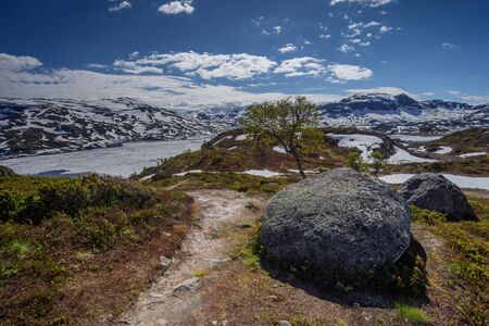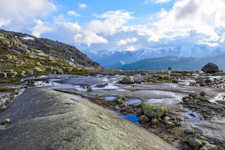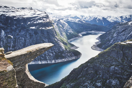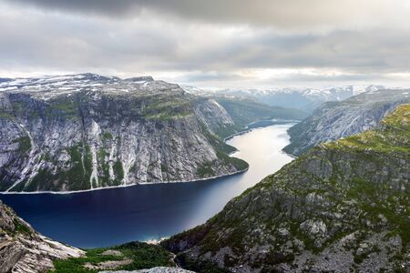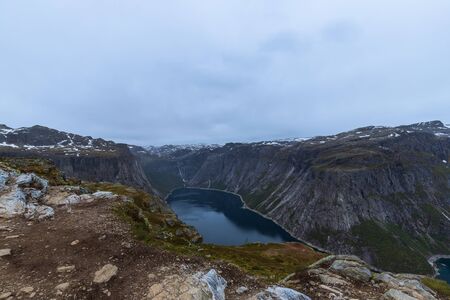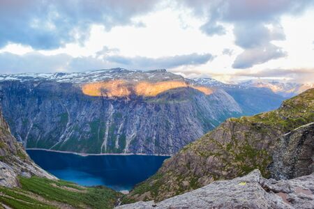 Typical norwegian landscape with snowy mountains and clear lake near the Trolltunga rock - most spectacular and famous scenic cliff in Norway