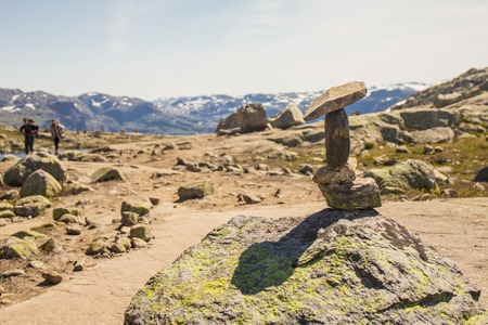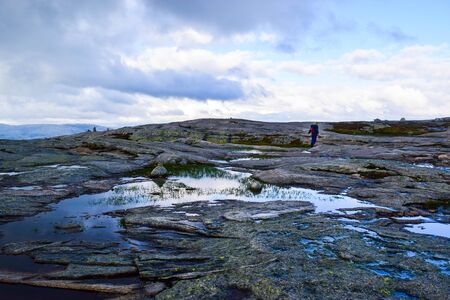 July 26, 2019. Norway tourist route on the trolltunga. People tourists go hiking in the mountains of Norway in fine sunny weather to thetrolltunga. Hiking backpack theme.