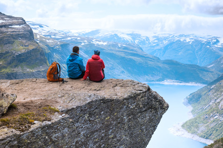 Two friends seats on Trolltunga in Norway