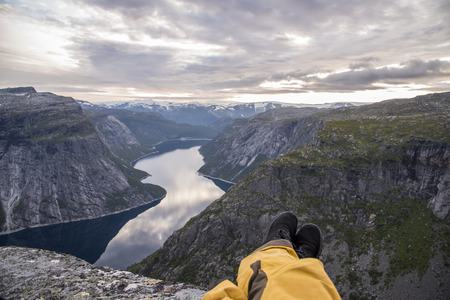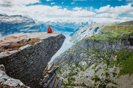 Tourist man sitting in the Trolltunga and enjoys the beautiful view of the Norwegian fjord.