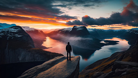 A man is standing on top of the mountain and enjoying the beautiful view during a vibrant sunset with Generative AI Technology