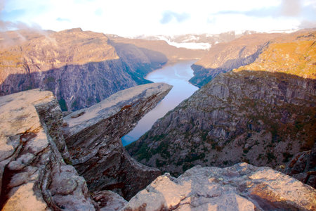 Troll's Tongue rock in Norway. Tourist attraction known as Trolltunga. Rock pulpit over lake.