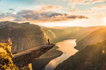 Tourist stands alone on Troll tongue rock. Famous natural landmark in Vestland county, Norway - Trolltunga. Wanderlust. Sunrise in mountains.