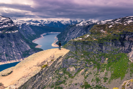 Trolltunga hike in Norway in cloudy bad weather, hiker tourist backpacker standing on the cliff and looking at fjord with moody sky