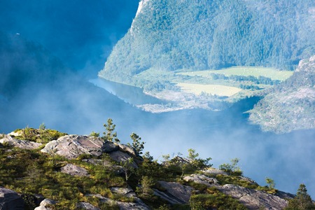 Lake in the mountains in foggy morning, Norway. Ringedalsvatnet lake on the hiking trek to Trolltunga. Summer landscape