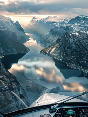 Aerial view of Norwegian fjord landscape with deep blue-green water, surrounded by towering mountains. Sky above features orange, pink hues, sunrise sunset. Ideal for travel agency, tour promotions.