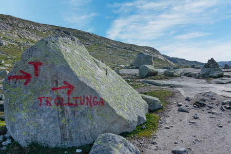 Hiking tourist route sign to Trolltunga rock, Norway