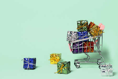 Small decorative trolley with present boxes on bright colorful background. Christmas or birthday gift. Sales and shopping concept. Image is with copy space