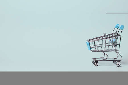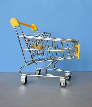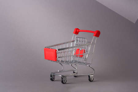 Miniature empty pushcart, customers truck, shopping trolley in mall, supermarket. Consumtion, commerce, trade, shopaholism concept. copyspace.