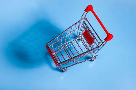 Empty shopping cart for goods from the supermarket on a blue background. Shopping concept, free space, isolate