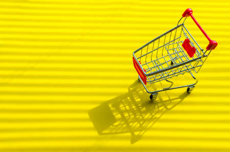 Supermarket cart on yellow background. Copy Space. Shopping concept. Flat lay.Shopping cart