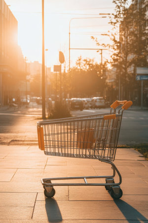Empty shopping cart catches the warm glow of sunset in an urban setting representing simpler living