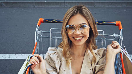 Shopping cart in woman's hands. Offer, consumer and buying concept