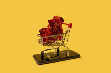 Online gifts for sales and purchases in the online store. On a yellow background.