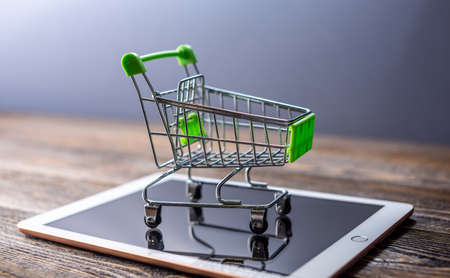 Small shopping cart and tablet. Concept of buying goods online with delivery from the comfort of your home.