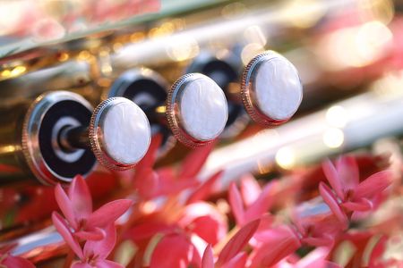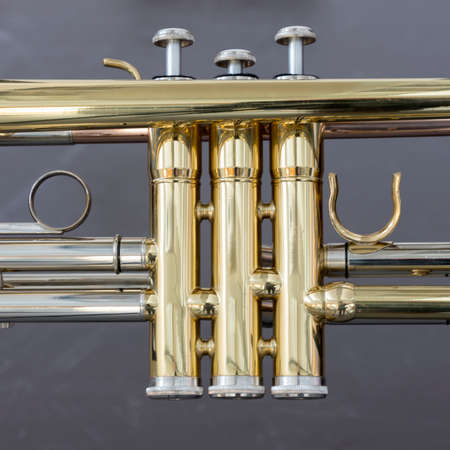 Brass vintage trumpet in gentle illumination. Jazzman holds the musical instrument in his hands while pushing on buttons.