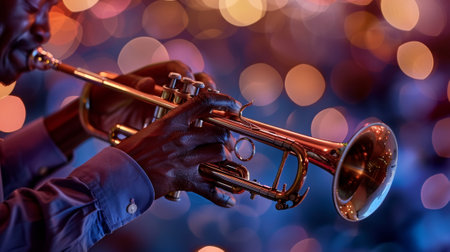 Closeup of a jazz musician playing the trumpet with vibrant bokeh lights