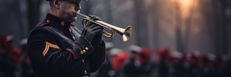 Close up of a young man in a white headband and dark uniform playing a trumpet with a brassy tone, golden light highlights the instrument, in a marching band setting. Background features blurred musicians in similar uniforms.