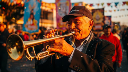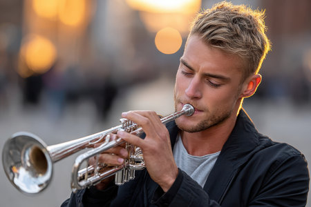 Music fills the air as a young man skillfully plays his trumpet during sunset in a lively urban square.