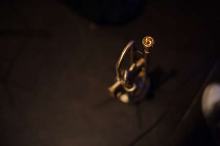 Gold trumpet standing on the dark floor on the blurred background in the night club