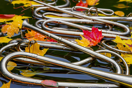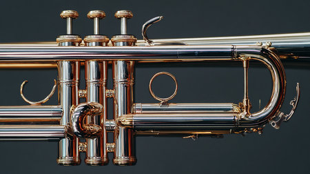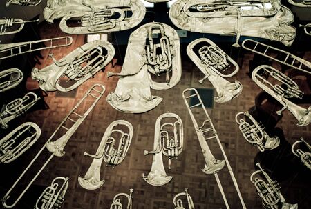Jazz Musicians. Close-up of brass instruments. Trumpet. French Horn Close up of musicians' hands.
